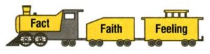 The page that really stuck in my mind was a drawing of a train illustrating fact, faith and feeling. The title of the page is called “Do not depend on feelings.” The illustration showed the locomotive labeled “fact”, the car being carried by the locomotive “faith” and the caboose is labeled “feeling.” The explanation says that a train can run with or without the caboose. However, it would be useless to pull the train by the caboose. You get the idea.